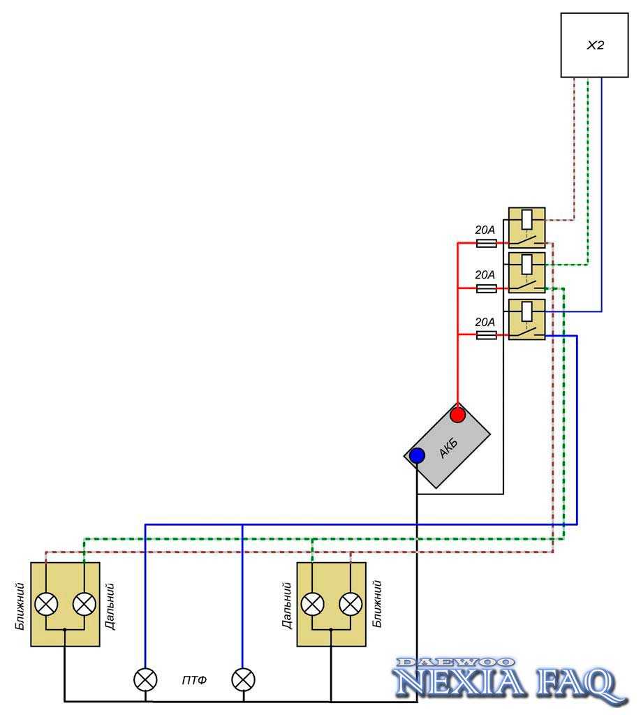 Штатно на нексии проводка на фары некорректная, идет через контактную группу замка зажигания. Решено было изменить ее, чтобы избежать ненужных потерь – теперь питание на фары будет идти напрямую с АКБ и включаться с помощью реле. К примеру, как видно из схемы, старый провод питания ближнего света фар (коричневый) раньше шел напрямую на фару, а после изменения схемы он идет управляющим на реле, которое в свою очередь дает «плюс» АКБ напрямую на фару