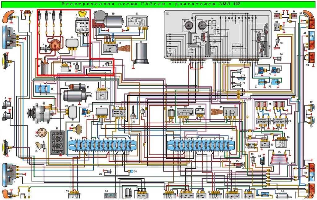 Ниже представлена схема электропроводки Газель — двигатель 402 которой позаимствован у Волги вместе со всеми конструктивными элементами, и об этом забывать не стоит. Выделенный красным контуром фрагмент – зона пристального внимания.
