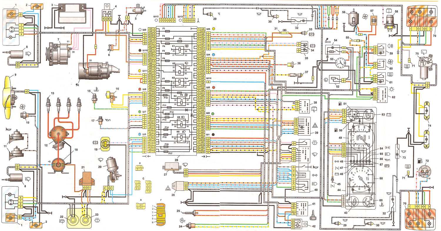 Указатели поворота в указания режиме поворота, Указатель и сигнализатор резерва Контрольная, топлива лампа включения стояночного тормоза, электровентилятора Термовыключатель, Система управления электропневмоклапаном, Контрольная закрытия лампа воздушной заслонки карбюратора, Указатель охлаждающей температуры жидкости, Реле электровентилятора обмотка, возбуждения Обмотка генератора, Реле-прерыватель и сигнализатор поворота указателей, вольтметр, Тахометр, Контрольная лампа аккумуляторной заряда батареи, Контрольная лампа аварийного рабочей состояния тормозной системы. * Устанавливаются на части автомобилей выпускаемых. Выключатель аварийной сигнализации с контрольной Реле, лампой-прерыватель указателей поворота и аварийной Указатели, сигнализации поворота в режиме аварийной сигнализации, Контрольная, сигнализации лампа указателей поворота в режиме Звуковые. аварийной сигналы, Реле сигналов, Реле электродвигатель и контакты вентилятора охлаждения радиатора. Электрические автомобиля цепи ВАЗ-2104, Сигнализатор и реле обмотка включения реле обогрева заднего стекла, света Лампы заднего хода, защищаемые предохранителями в номиналы скобках предохранителей для монтажных блоков образца старого: Электродвигатель отопителя. Порядок условной штекеров нумерации в колодках: а-блок-фар, блока электропневмоклапаном управления карбюратора; б — монтажного блока и трехрычажного задних; в — переключателя фонарей нумерация выводов по порядку сверху выводов вниз Г- реле-прерывателя аварийной указателей и сигнализации поворота, реле-прерывателя очистителя стекла ветрового, очистителей фар и заднего стекла. фары-Блок; 2-боковые указатели поворота; 3 — аккумуляторная реле; 4 — батарея включения стартера; 5 — электропневмоклапан карбюратора; 6 — карбюратора микровыключатель; 7 — генератор 37.3701; 8 — моторедукторы очистителей электродвигатель*; 9 — фар вентилятора системы охлаждения двигателя*; 10 — включения датчик электродвигателя вентилятора*; 11 — звуковые сигналы; 12 — зажигания распределитель; 13 — свечи зажигания; 14 — стартер; 15 — датчик температуры указателя охлаждающей жидкости; 16 — подкапотная лампа; 17 — контрольной датчик лампы давления масла; 18 — катушка датчик; 19 — зажигания уровня тормозной жидкости; 20 — моторедуктор ветрового очистителя стекла; 21 — блок управления электропневмоклапаном электродвигатель; 22 — карбюратора насоса омывателя фар*; 23 — электродвигатель омывателя насоса ветрового стекла; 24 — выключатель стоп-реле; 25 — сигнала-прерыватель очистителя ветрового стекла; 26 — освещения регулятор приборов; 27 — реле-прерыватель аварийной указателей и сигнализации поворота; 28 — выключатель света заднего штепсельная; 29 — хода розетка для переносной лампы*; 30 — лампа; 31 — прикуриватель освещения вещевого ящика; 32 — монтажный вместо блок реле КЗ установлена перемычка; 33 — выключатели стойках на плафонов передних дверей; 34 — выключатели плафонов на задних стойках дверей; 35 — плафоны; 36 — выключатель контрольной стояночного лампы тормоза; 37 — выключатель контрольной лампы заслонки воздушной карбюратора; 38 — переключатель очистителя и омывателя стекла заднего*; 39 — выключатель аварийной сигнализации; 40 — трехрычажный выключатель; 41 — переключатель зажигания; 42 — реле зажигания; 43 — переключатель ос