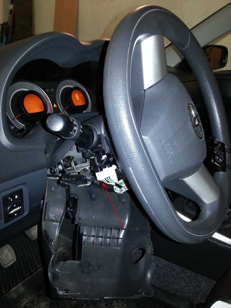 Многие ставят выключатель на месте, где находится монетница Toyota Corolla. Чтобы это сделать, достаточно просто ее перевернуть. Чтобы подключить включатель, придется убрать кожух на рулевой колонке. Нижняя часть закреплена к ней при помощи саморезов, поэтому сделать это будет несложно. Красной стрелкой показан разъем, который нам понадобится.</li>