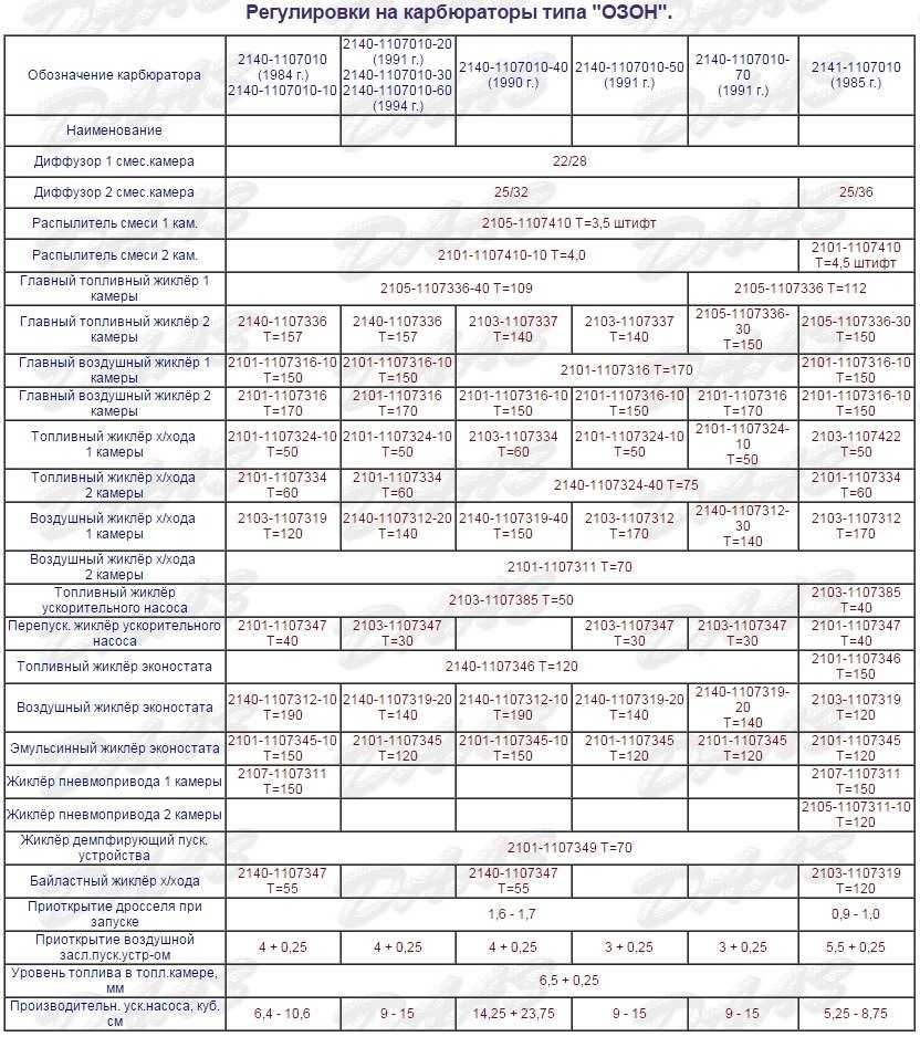 Регулировочные данные карбюраторов «Озон» модификации 2140-…
