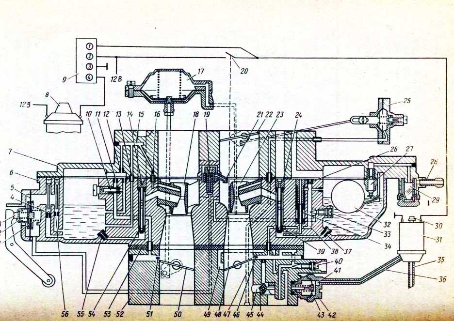 Ускорительный насос – мембранного типа, смонтирован сбоку поплавковой камеры на вертикальном фланце. Привод насоса осуществляется от рычага дроссельной заслонки через профильный кулачок, рычаг и толкатель 3. Мембрана 5 насоса со стороны толкателя 3 нагружена демпфирующей пружиной 2, а со стороны корпуса поплавковой камеры – возвратной пружиной 1. В насосе имеется впускной канал с жиклером и обратным клапаном 4 и винт регулировки перепускного клапана 56. Распылитель 21 снабжен калиброванным жиклером и нагнетательным клапаном 19. Распылитель обеспечивает затяжной направленный впрыск топлива в первичную камеру между стенкой поплавковой камеры и малым диффузором.