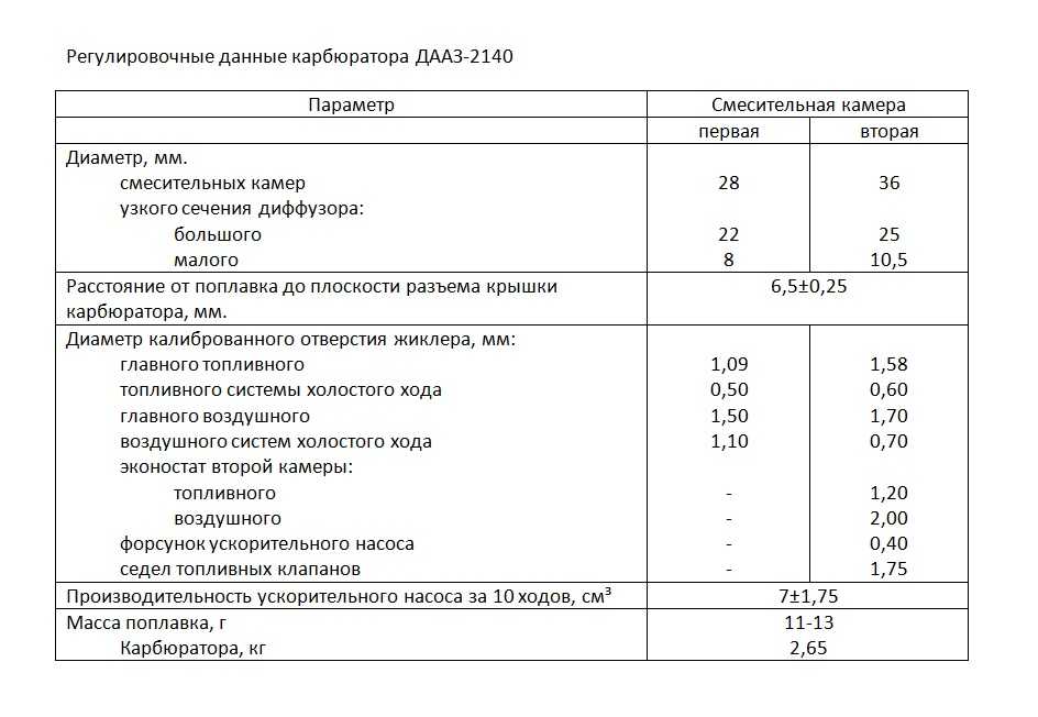 Тарировочные данные карбюраторов ДААЗ-2140 и -2141 разных модификаций: