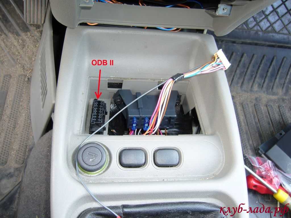 - Когда действия будут выполнены, всю обмотку нужно будет протянуть непосредственно под центральной консолью и надежно уложить, чтобы она не болталась и не перетиралась. Для этого можно выкрутить болты крепления и демонтировать пепельницу, а сам пучок с проводкой можно продеть вниз. Затем демонтируйте правую крышку тоннеля пола, проденьте разъем компьютера к диагностической колодке. После вам остается подключить обратно аккумулятор и проверить, как работает сам БК.