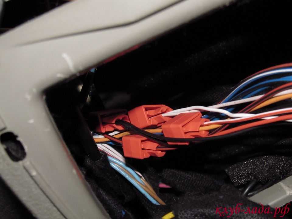 - Когда вы подключите все четыре кабеля к этому разъему, необходимо заняться врезанием к розовому проводу, расположенному на задней колодке контрольного щитка. Сама колодка располагается в достаточно труднодоступном месте, так что если вам нужно получить к ней доступ, то придется демонтировать монтажный блок с предохранителями и потянуть его.