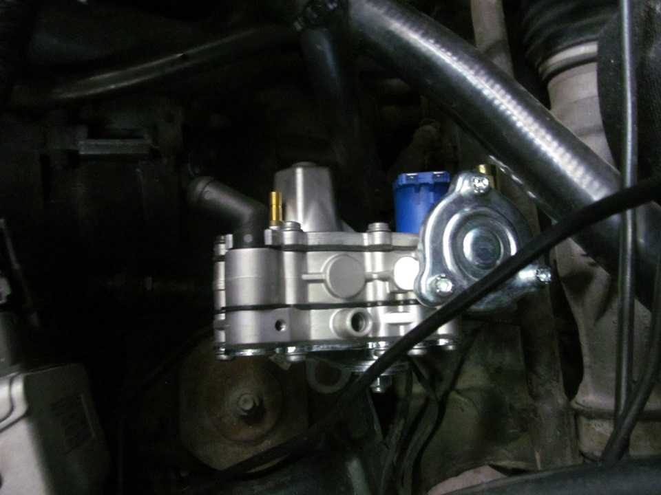 Выбираем место для крепления газового редуктора, у нас в данном случае это место крепление подушки двигателя автомобиля. Затем при помощи кронштейна, который идет в наборе с редуктором примеряем его по месту и выгибаем нужной нам конфигурации, далее производим крепеж редуктора газовым фильтром в верх.