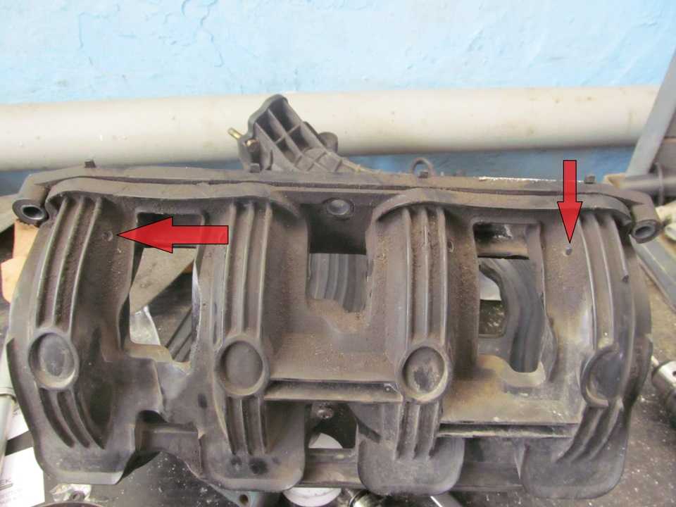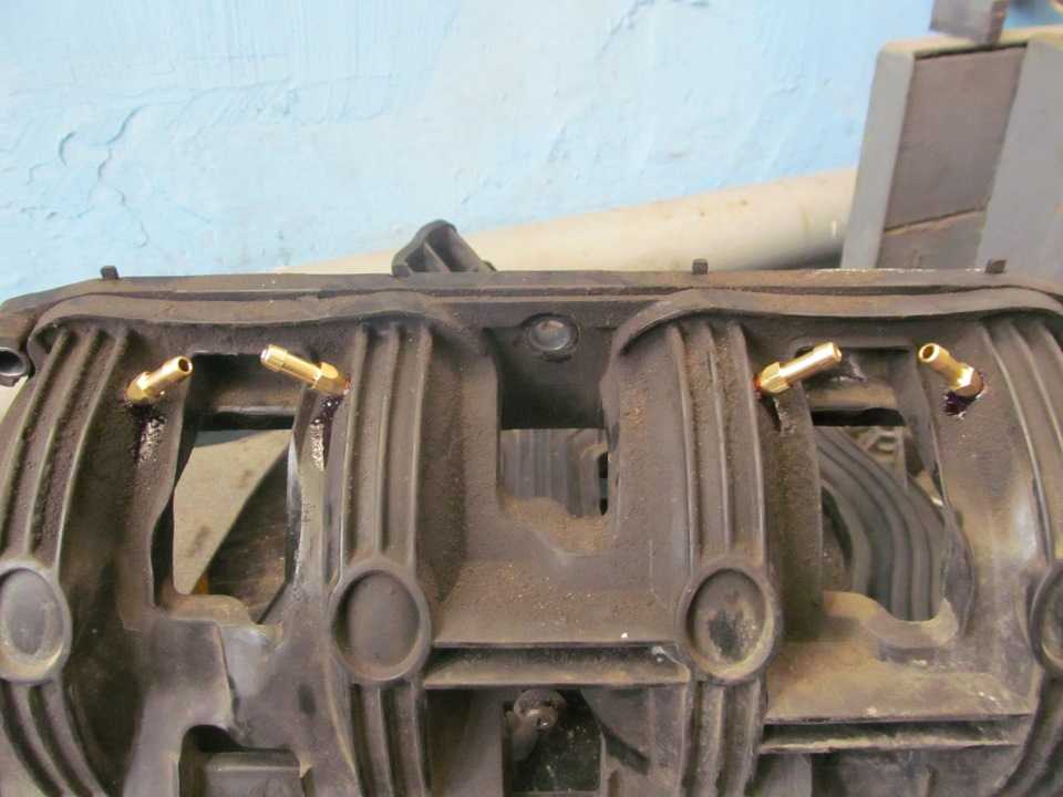Снимаем впускной коллектор и делаем отверстия диаметром 5мм на уровне разъема бензиновых форсунок под углом так, что бы в дальнейшем они не мешали друг другу при установке газовых трубок, и не в коем случае не против забора воздуха идущего по коллектору.