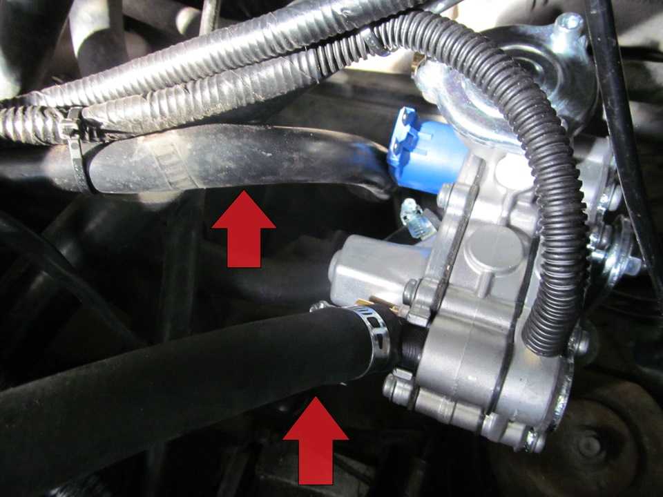 Подсоединяем к редуктору тосольные шланги диаметром 16мм, предварительно отрезав нужную длину (ближащее и удобное место к тосольному шлангу автомобиля который подходит к охлаждению дроссельной заслонки двигателя). Ко вторым концам тосольных шлангов идущих от редуктора ставим переходники с 16мм на 10 мм зажимая их хомутами.