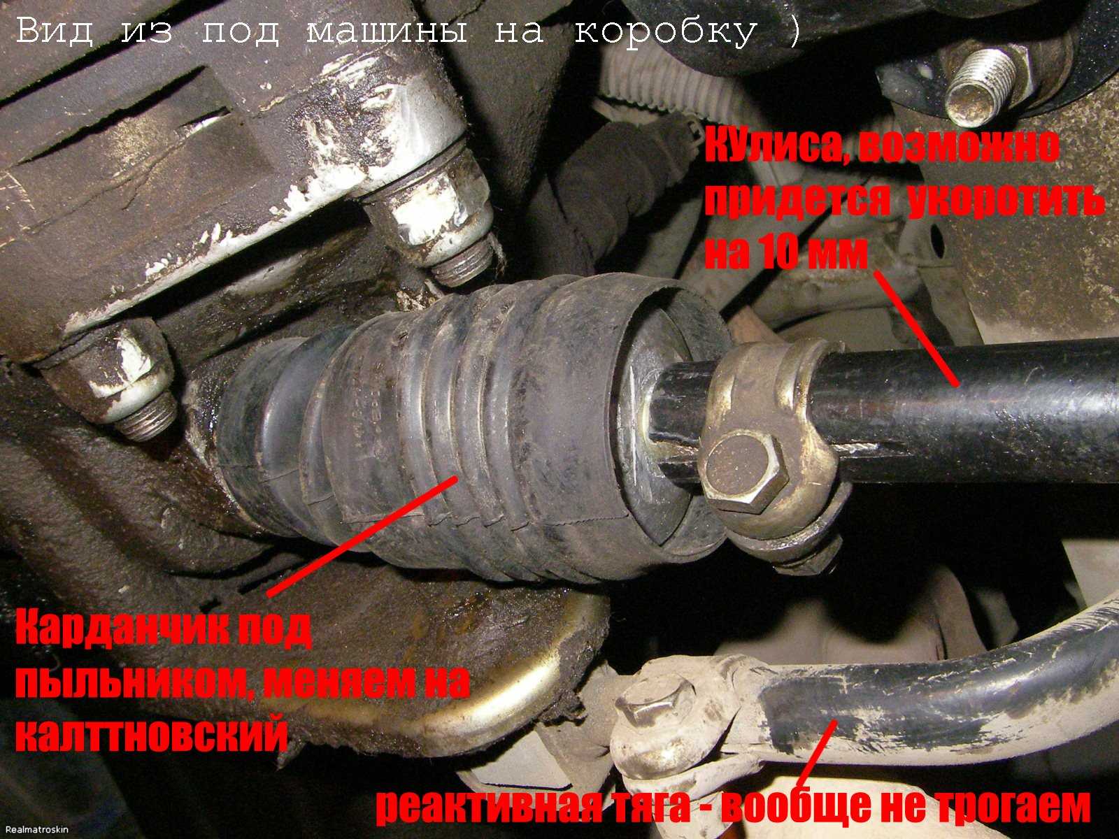 - На фотографии заметно, что штоки карданчиков различны по длине. Такую проблему можно решить укорачиванием «Калиновского» штока, учитывая тип короткоходной кулисы. Иногда шток полностью не заходит, поэтому рычаг коробки смещается к ручнику. Если нужно укоротить, отрезаем 1-2 сантиметра.