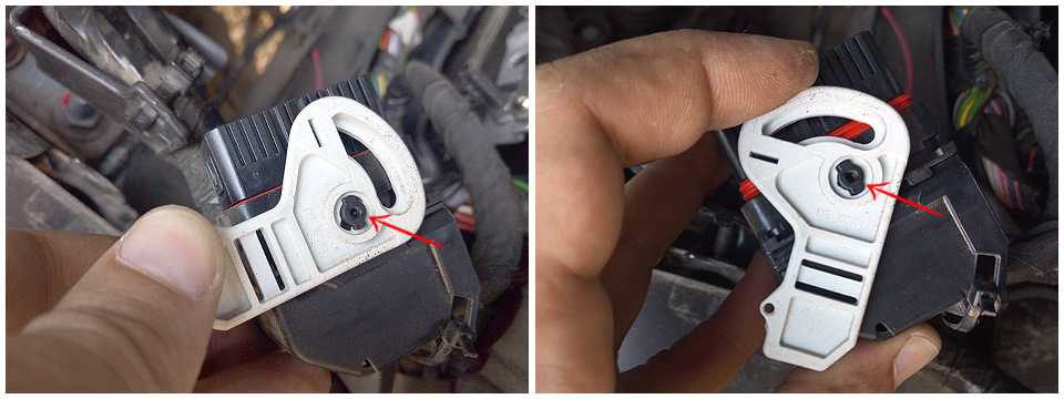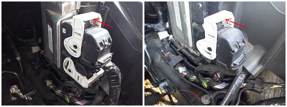 Теперь ничего не мешает добраться до двух колодок в ЭБУ. Для подключения круиза нужен доступ к нижней колодке. Для этого нужно снять сначала верхнюю колодку. Надавливаем на фиксатор…