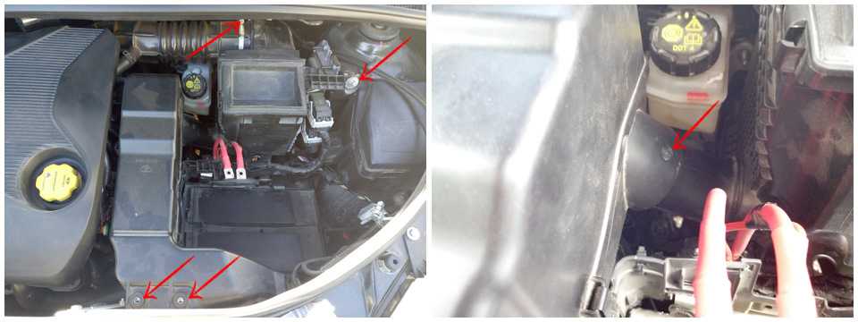 Для удобства монтажа и протяжке проводов внутрь салона, лучше снять аккумулятор и воздушный фильтр вместе с воздухозаборником.Первым делом ключом на 10, скидываем клеммы аккумулятора, затем ключом на 13 или битой Т40 отворачиваем болт крепления прижимной пластины аккумулятора. Вынимаем аккумулятор.