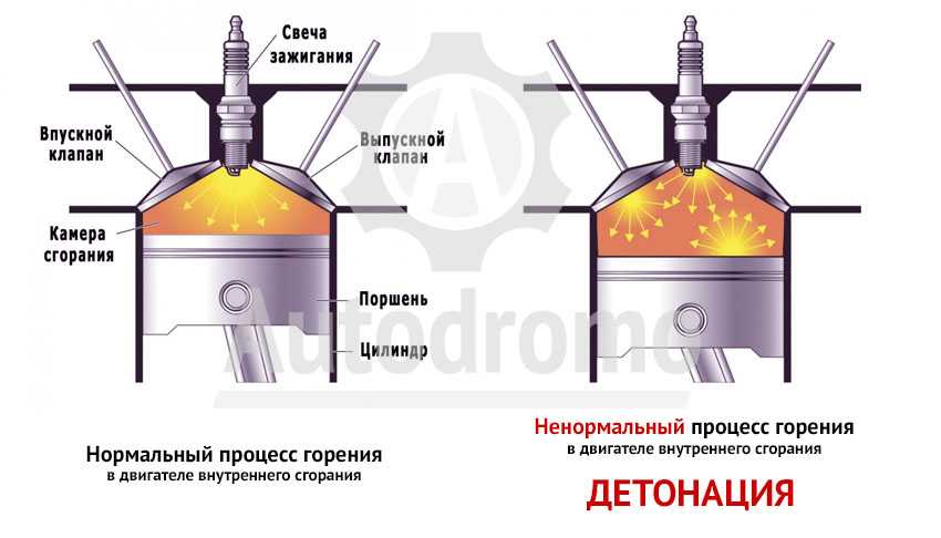 Пока фронт пламени идет от свечи зажигания к дальним зонам камеры сгорания, может произойти ее самовоспламенение до прихода огня. Несомненно, из-за этого возникает слабая ударная волна, которая встречает на своем пути подготовленное к воспламенению топливо.