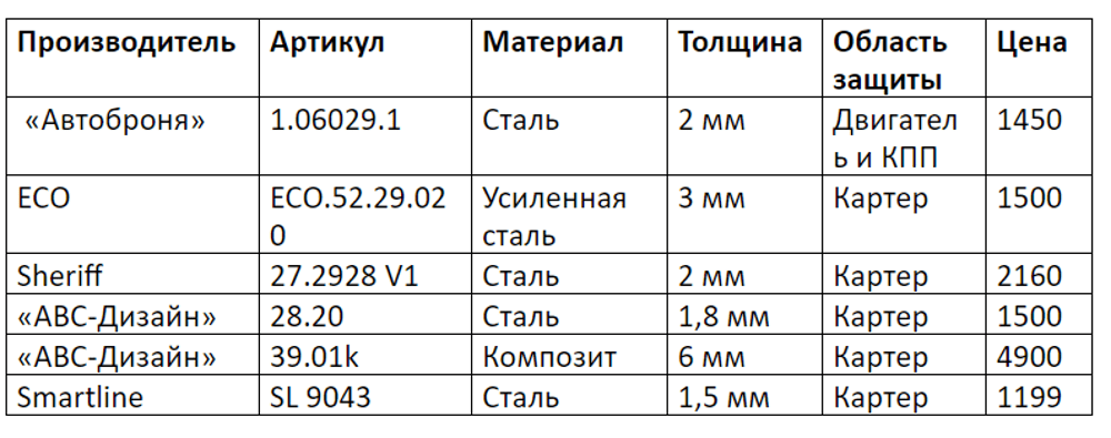 Разные производители предлагают примерно одинаковые модели защиты, которые имеют незначительные различия в дизайне. Главное в защите – это толщина металла. Оптимальным вариантом считается защита картера толщиной в 2-2,5 мм, но можно найти и более «мощные» варианты.