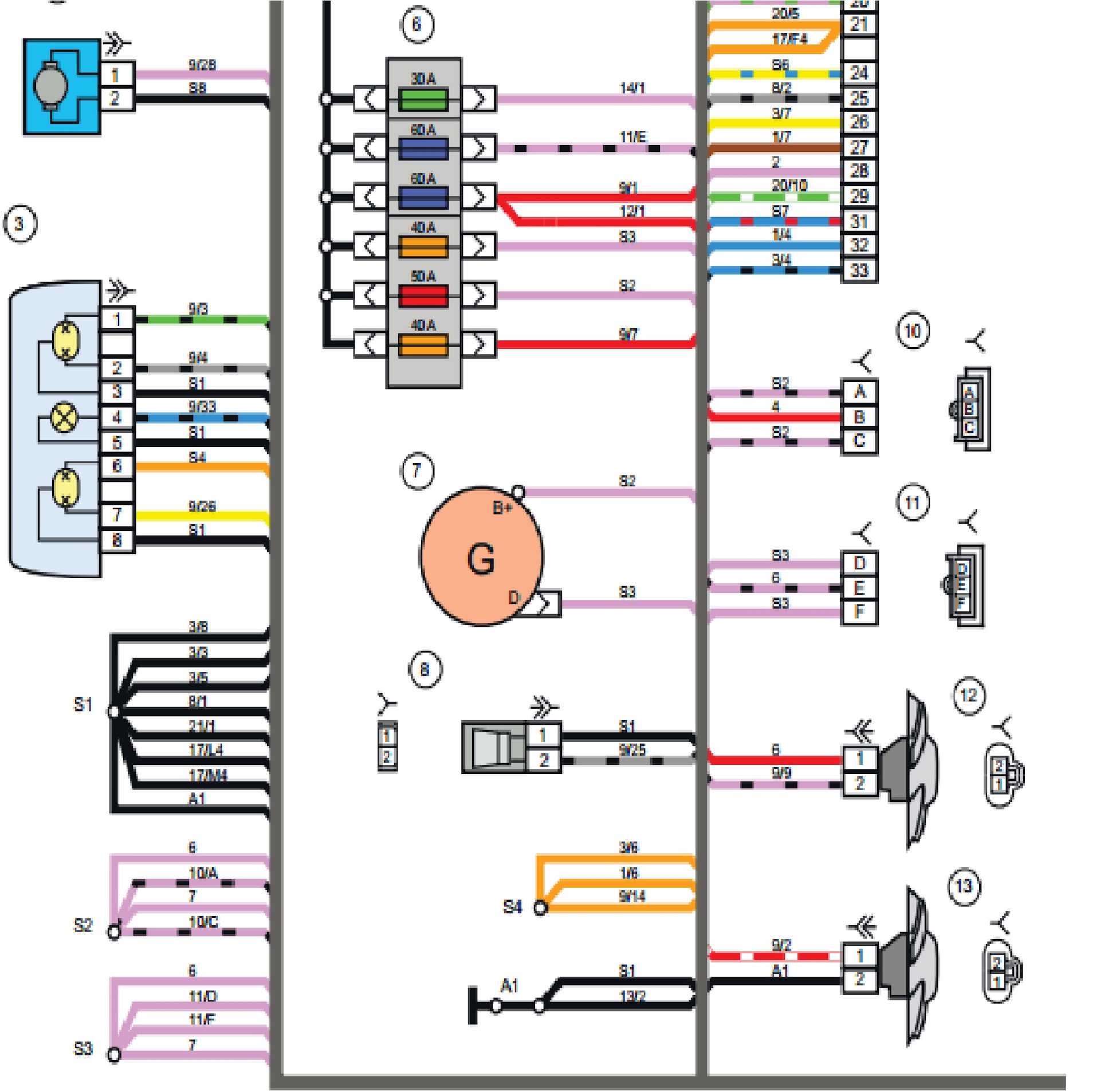 Общая карта подключения включает в себя условные обозначения, а также порядковые номера, присвоенные определенным токоприемникам. Все потребители энергии коммутируются на схеме электропроводки в одну большую сеть с помощью условных линий. Последние — проводники, каждому из которых присваивается определенный цвет для лучшей наглядности. Все электроцепи собираются в жгуты и подключаются к различным модулям с помощью специальных колодок.