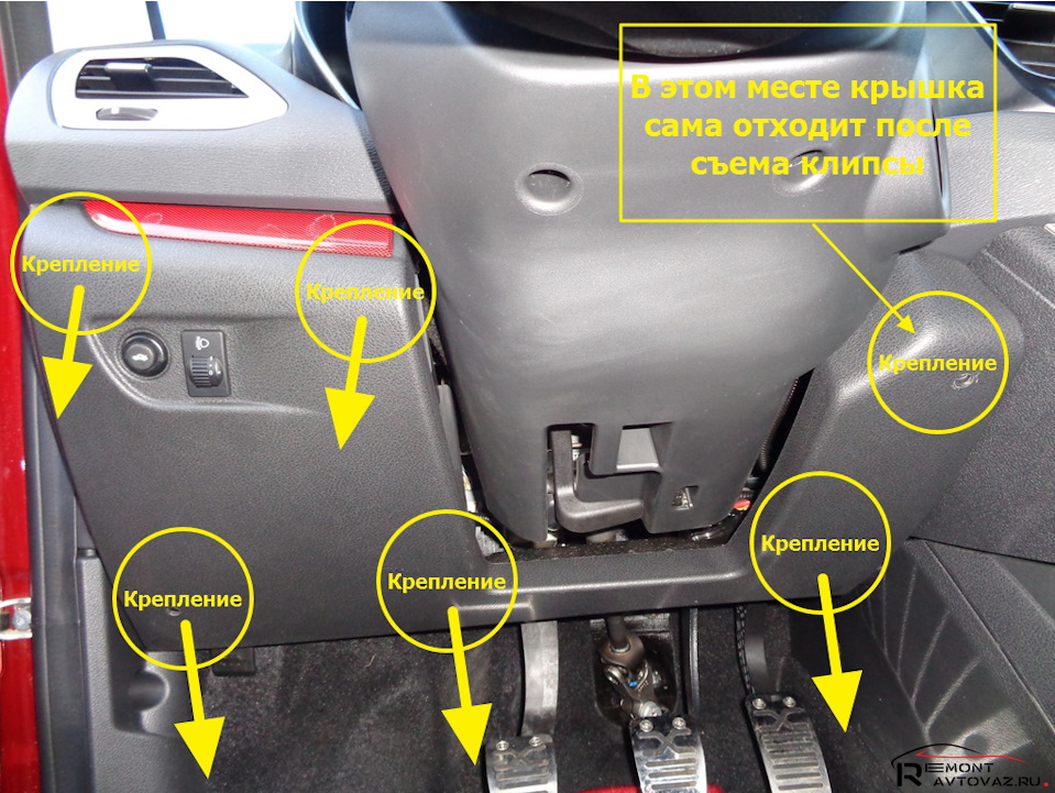 - Под рулевой колонкой отщелкиваем пластиковый кожух, он крепится на шести клипсах.