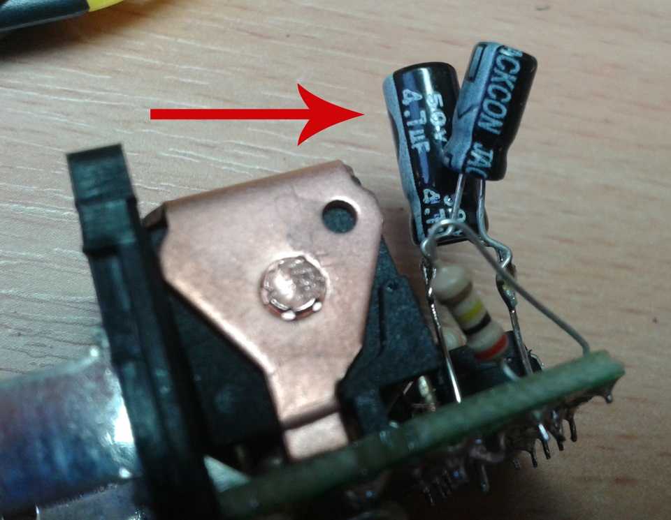 Далее к штатному конденсатору (на 2 мкф 50 вольт) подпаял еще один (на 4,7 мкф 50 вольт).