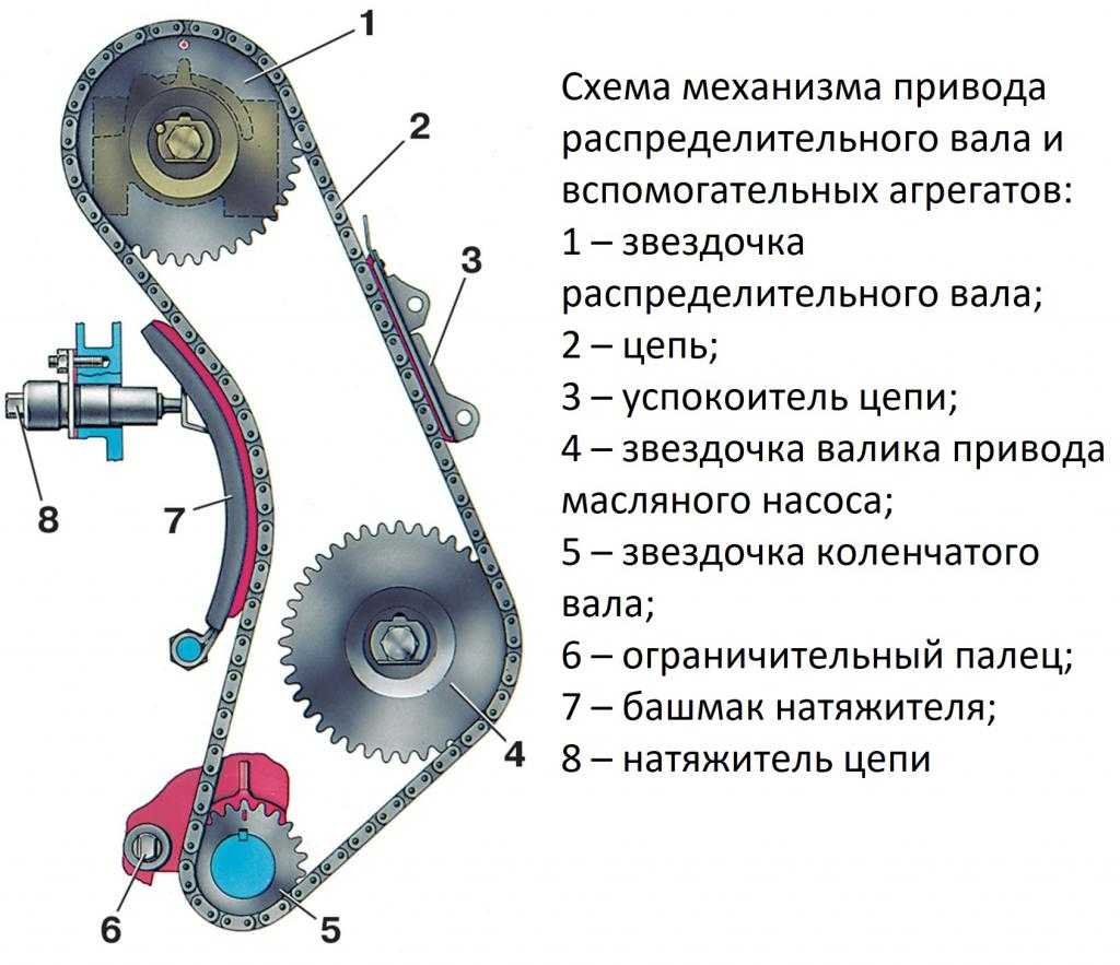 Отвечает за качество работы двигателя цепь, которая синхронизирует циклы поршней с открытием и закрытием соответствующих клапанов. Как известно, процесс сжигания горючей смеси в каждом цилиндре происходит в определённой последовательности, обеспечивающей возвратно-поступательное движение поршней, которое преобразуется во вращательное движение коленвала. Инжектор впрыскивает топливо согласно строгого порядка, благодаря которому достигаются оптимальные показатели двигателя внутреннего сгорания (ДВС) по мощности и расходу топлива. Посредством цепной передачи от коленвала к распредвалам достигается качественная и согласованная работа всех элементов ДВС с заводскими настройками инжектора.